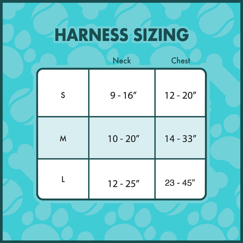 (Small) Neck: 9”-16” X Chest: 12”-20”; (Medium) Neck: 10”-20” X Chest: 14”-33”; (Large) Neck: 13”-25” X Chest: 23”-45”