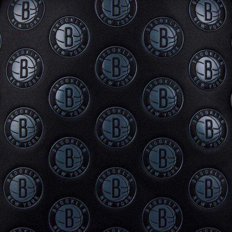 Create a winning game plan that shows your team spirit with this NBA Brooklyn Nets Logo Mini Backpack. The embroidered logo patch for the Brooklyn Nets prominently appears above the front zipped compartment. The logo includes a shield, with the word “NETS” arcing over a white basketball, with a black “B” in the middle. A debossed motif of another Brooklyn Nets logo—a black B encircled by the words “Brooklyn New York” in all capital letters— is set against a black background. White trim adds accent and contrast in team uniform color.