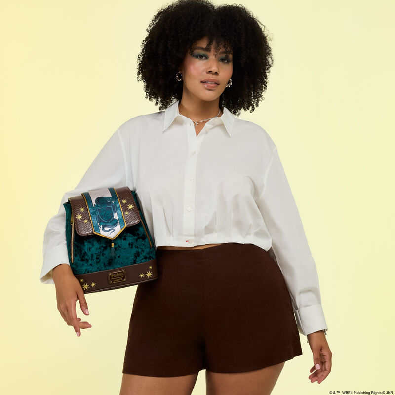 Prepare to be shocked – this mini backpack is so cute, it’s scary! Hello Kitty wears an iridescent outfit and coordinating bow to match the colors of the Halloween season. Open the bag’s hinged flaps to reveal her skeleton form, which glows in the dark when you turn out the lights! With adorably spooky artwork throughout its design, this accessory makes a frightfully perfect addition to any autumnal outfit.